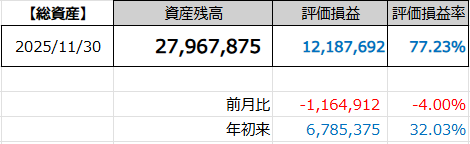 2025年11月末の総資産は2,796万円で、前月より116万円の減少でした。