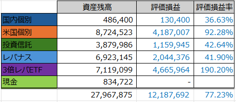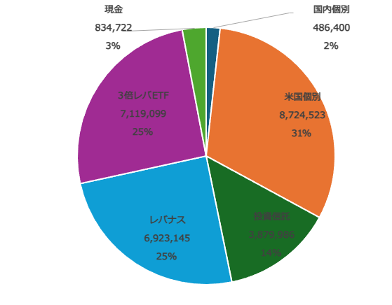 資産全体のレバレッジは1.76程度と前月から微減です。好調だった3倍レバが下がってしまったので仕方ないですね。