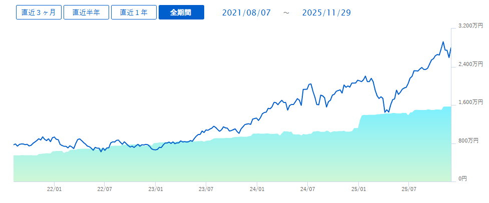 今月も残すところあと1ヶ月となりました。月々の積立や追加入金による買い増しがあるので、正確な数字ではないですが、年初から+600万円オーバーとなっています。2025年最後の月はプラスで終わりたいですね。特別なことはありませんが、相場はちらちら見ながらいそいそと労働に従事したいと思います。早く楽になりてー。