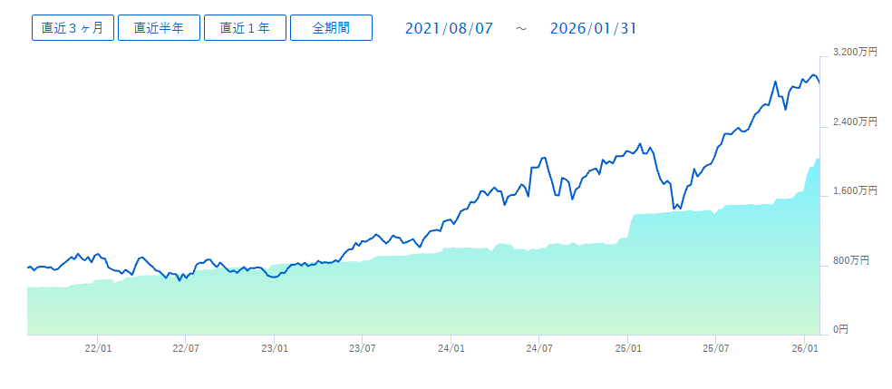 この推移グラフももう4年半の軌跡となります。直近の相場がえらく好調ですので爆増しておりますが、これからも初心を忘れず積み立てて、積み立てて、積み立てて参りたいと思います。