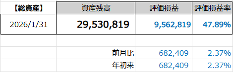 2026年1月末の総資産は2,953万円で、前月より68万円の増加でした。