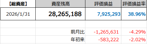 2026年2月末の総資産は2,826万円で、前月より126万円の減少でした。