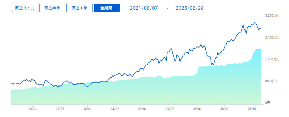 旧NISAの特定への払い出し、仕方ないんですが投資元本部分がドガっと上に伸びるので美しくないですね…。私は美的センスが一級なので元本ぐらい綺麗に、なだらかに右肩上がりにしていただきたいですわ。